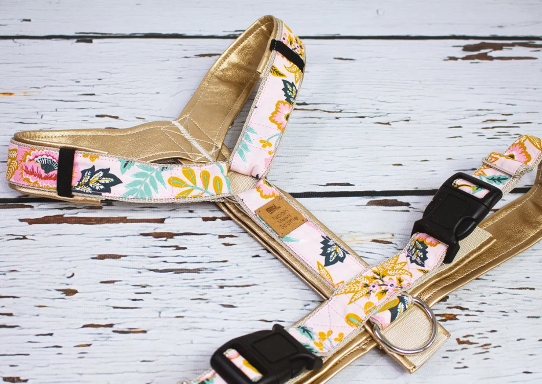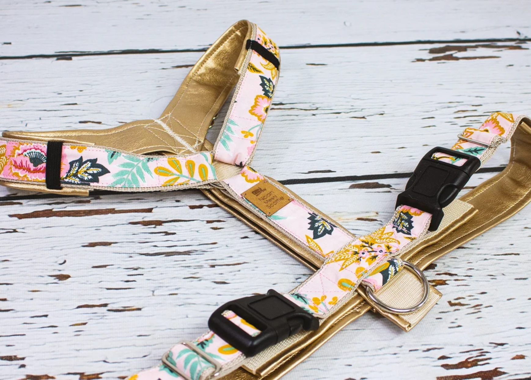Hundegeschirr MAYA SALE – Blumen Rosa Gold mit Kunstleder, Größe M nur 1x, 50 % reduziert